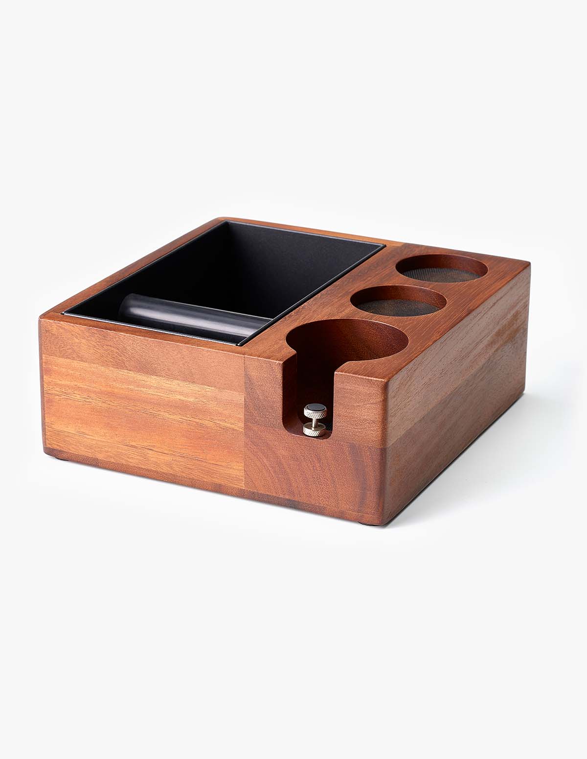 Multifunktionaler Abschlagbehälter aus Holz mit integrierter Tamper-Station. Praktisch, hochwertig und ideal für eine aufgeräumte Barista-Station.