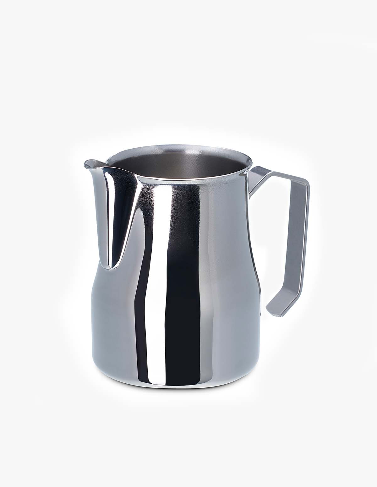Der speziell geformte Ausguss ermöglicht ein kontrolliertes und sauberes Giessen – perfekt für Latte Art und saubere Ergebnisse in der Tasse. Der ergonomische Griff liegt gut in der Hand und sorgt für eine sichere und komfortable Handhabung.